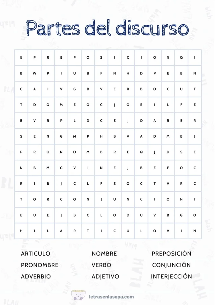 ¡Aprende y refuerza tu gramática con esta entretenida sopa de letras sobre las partes del discurso! Encuentra palabras clave como artículo, verbo, adjetivo y más, mientras te diviertes identificando cada elemento que compone una oración. Perfecta para estudiantes y amantes del lenguaje.