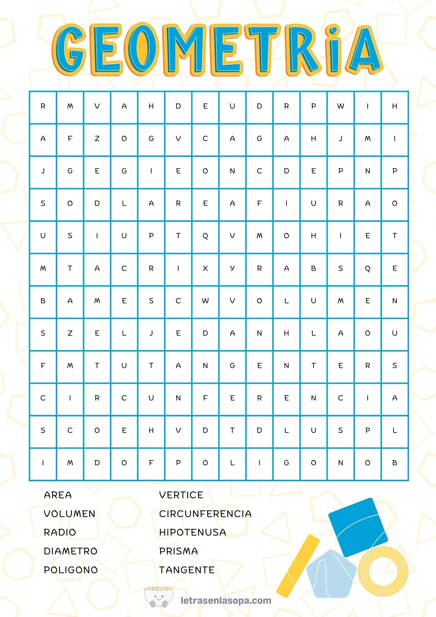 Descarga esta sopa de letras geometría para niños, perfecta para repasar figuras y conceptos básicos de manera divertida. Ideal para imprimir y usar en clase o en casa, esta actividad combina juego y aprendizaje de forma sencilla. Para seguir navegando donde lo dejaste usa el botón atrás de tu navegador o explora las opciones que te ofrecemos a continuación.