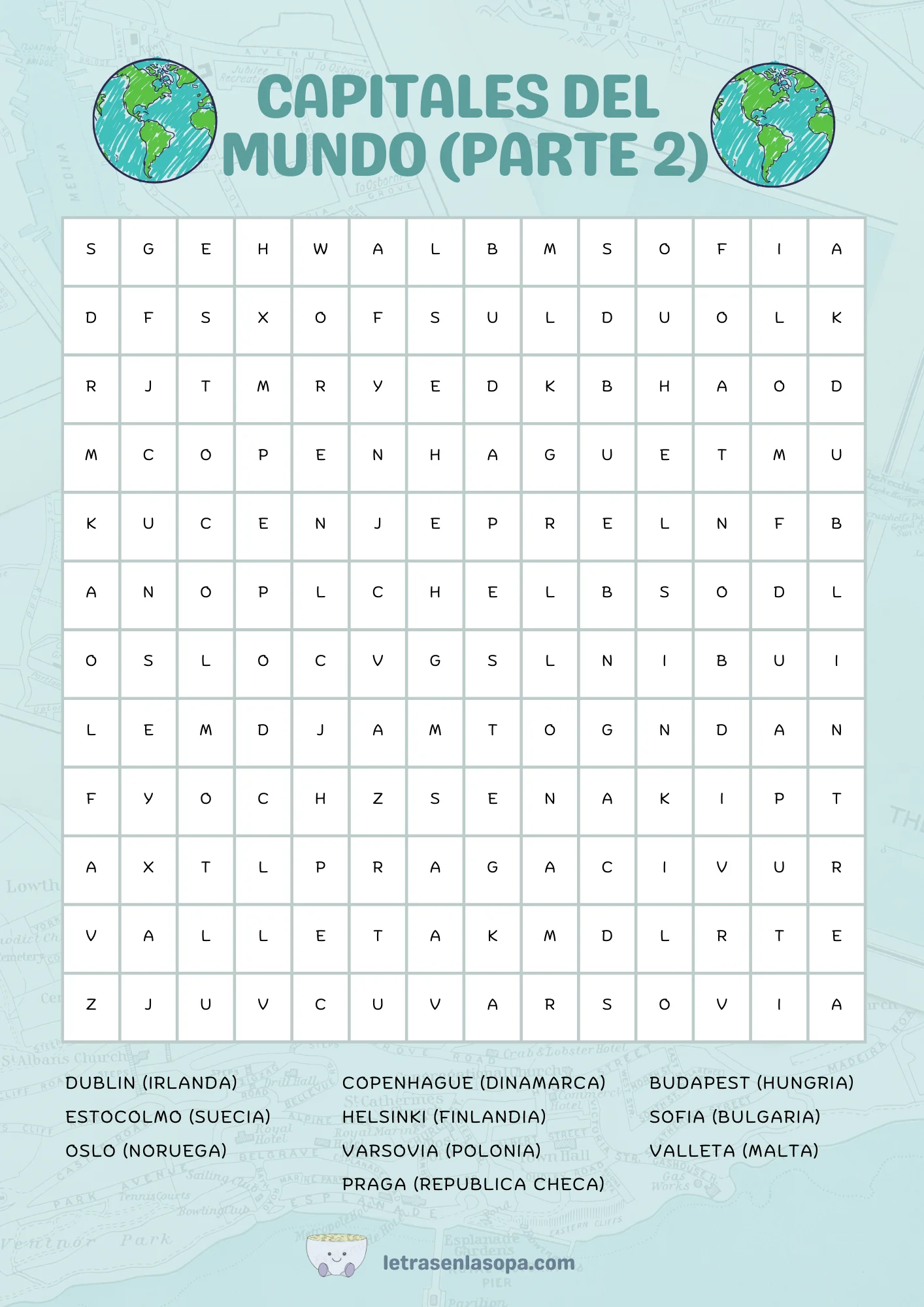 Continúa tu aventura geográfica con esta sopa de letras dedicada a las capitales del mundo (Parte 2). Desafía tu memoria encontrando capitales europeas como Dublín, Copenhague y Budapest. ¡Descárgala y sigue explorando las capitales más importantes del mundo!