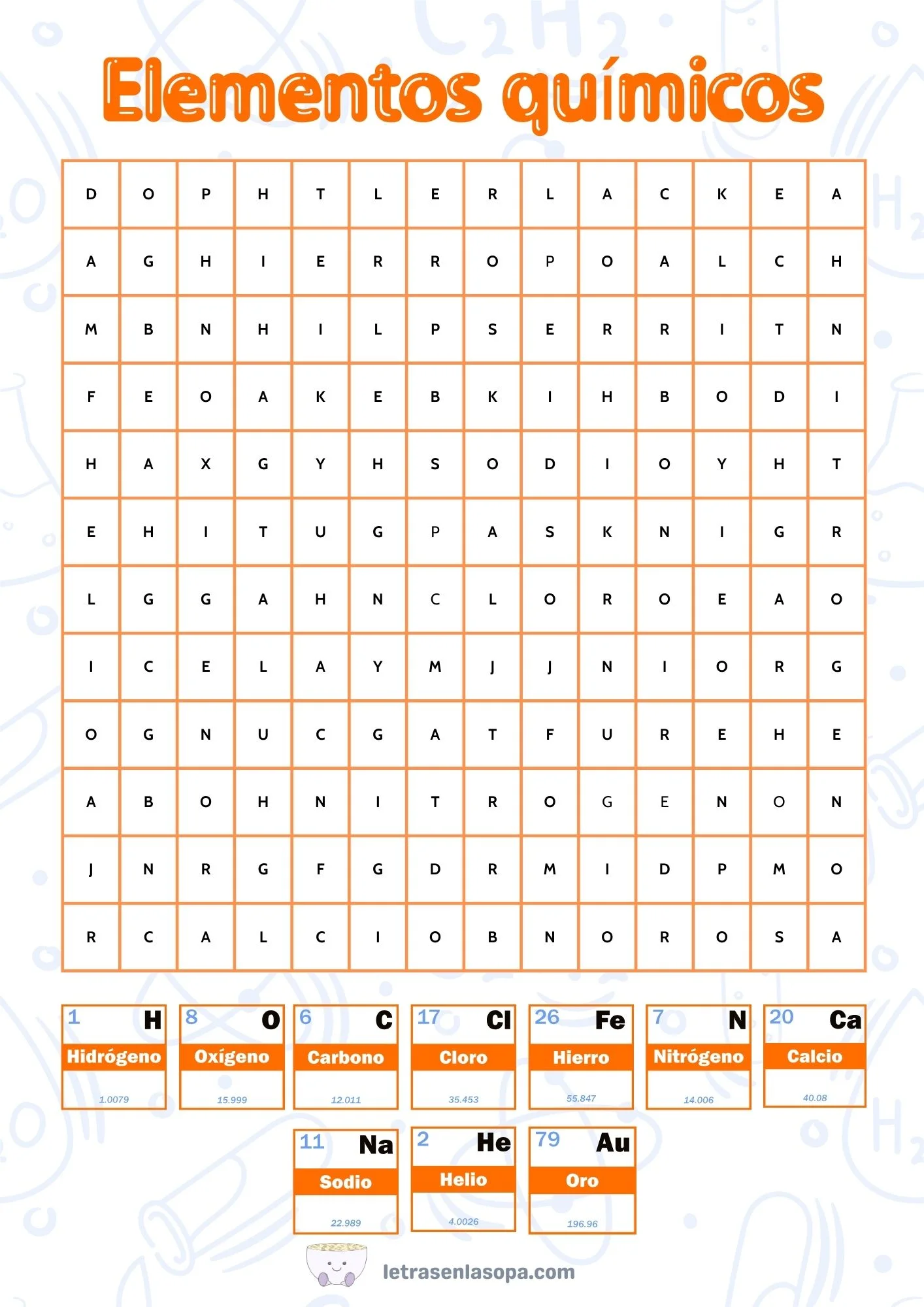 ¡Descubre el fascinante mundo de la tabla periódica con esta sopa de letras dedicada a los elementos químicos! Busca y encuentra elementos esenciales como el Hidrógeno, Oxígeno y Oro entre muchos otros. ¿Podrás identificarlos todos? ¡Descárgala y reta tu conocimiento científico!
